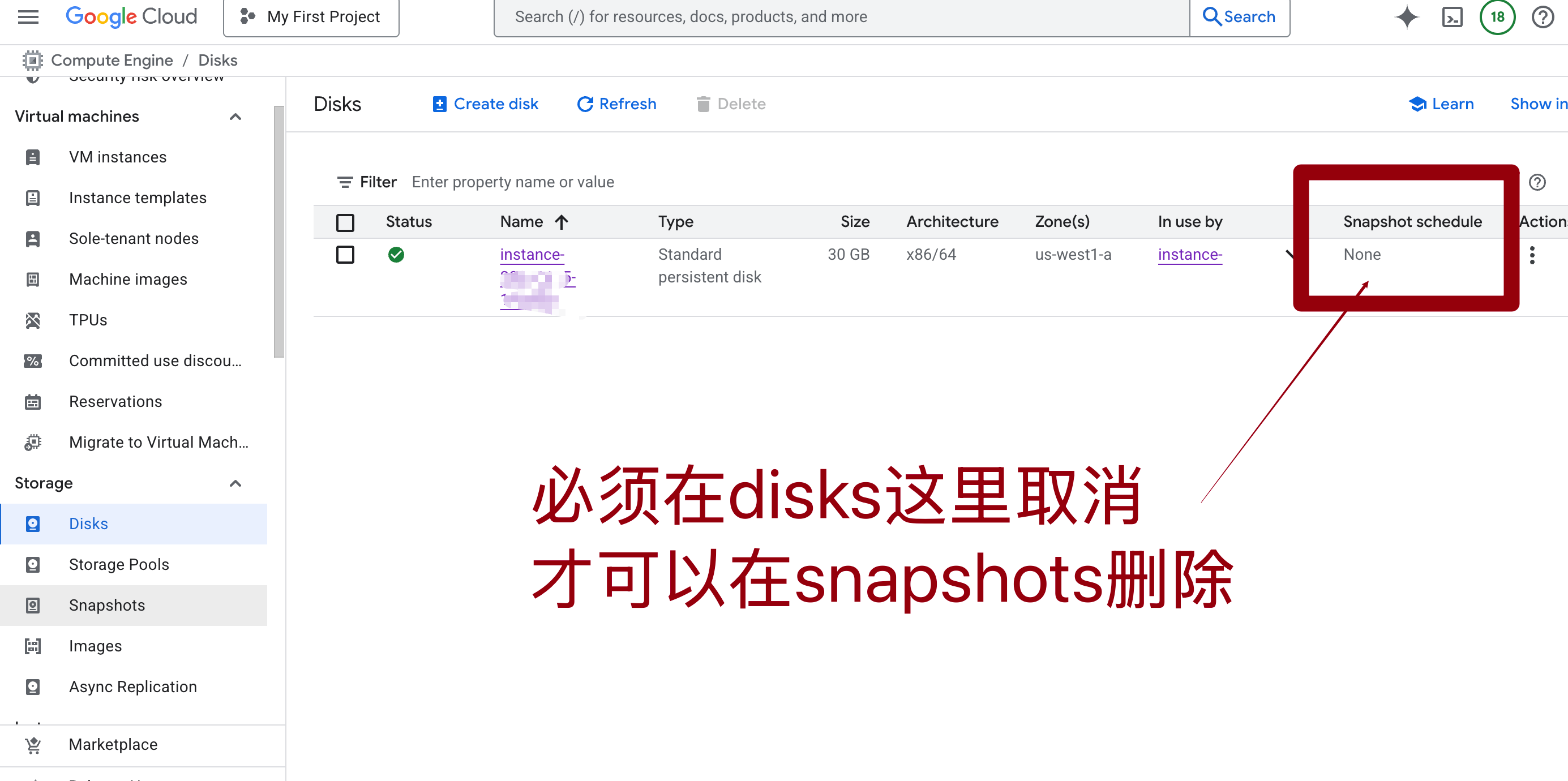 如果有,不要慌,进入到 disks 去删除。这里也得看一下自己的 type 是不是标准型的 30gb,如果不是的话就删实例吧。还有是美西哈